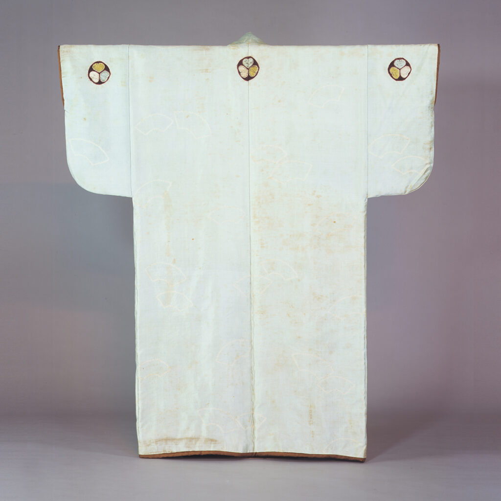 淡浅葱地葵紋付扇地紙文辻ヶ花染小袖